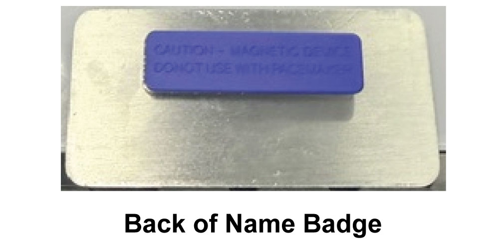 Domed Metal Name Badge featuring your logo and first/last name. Attachment is magnetic as to not damage apparel. 1.5" X 3" - Dome is applied as a liquid that hardens to a protective layer. Name prints in white. Ships directly from the manufacturer. Freight cost is included.