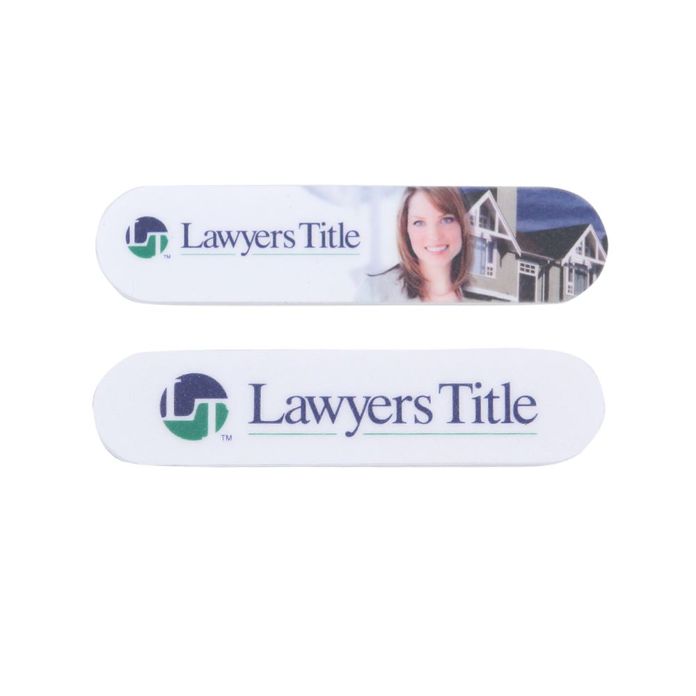 Two-sided salon-quality nail file with abrasive on both sides. (One side fine abrasive and other is medium.) Full custom logo imprint on both sides that will not wear down with use. 3-1/2” X ¾” X 1/8” thick.
